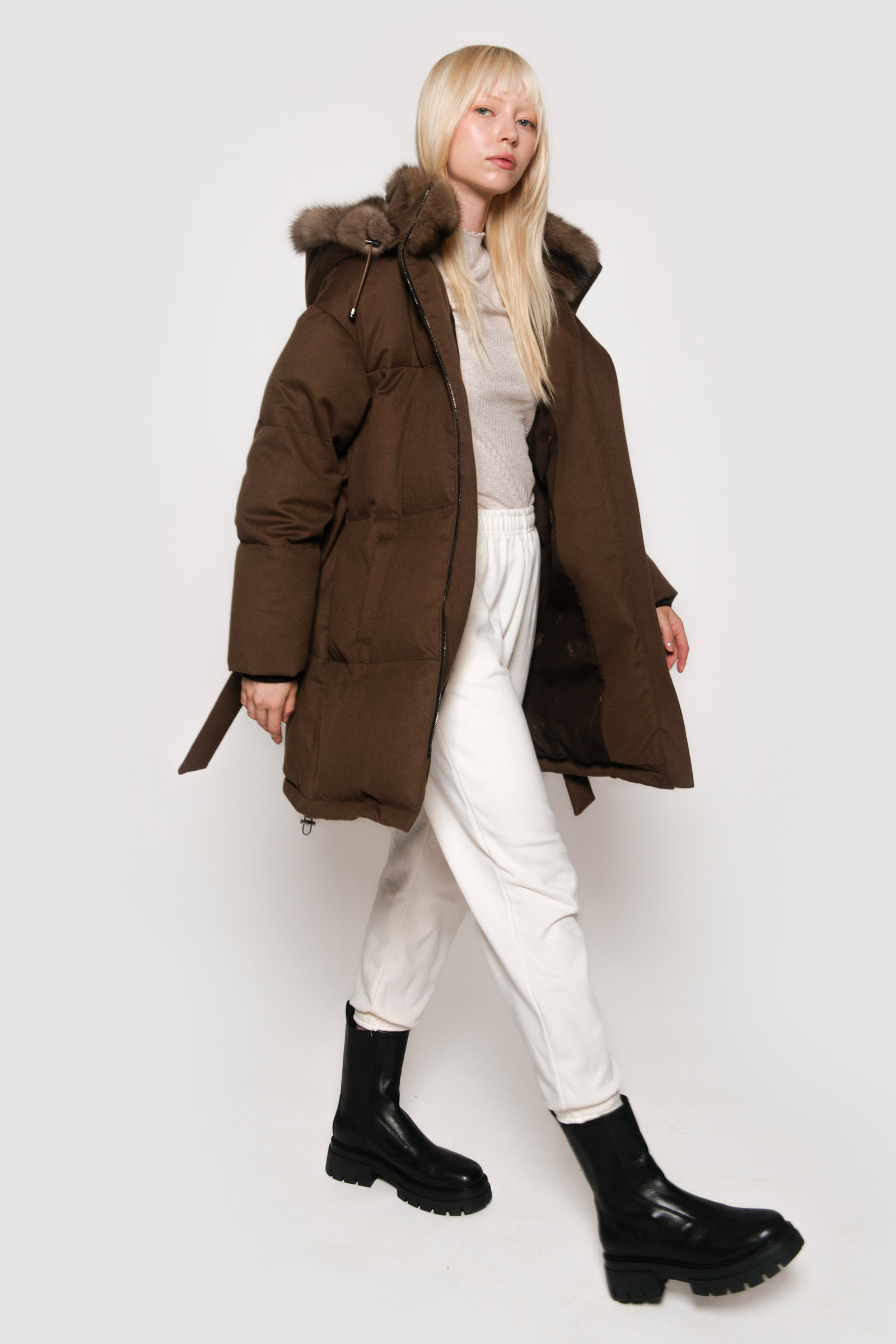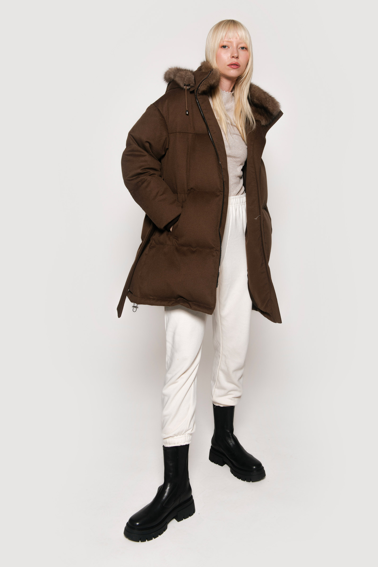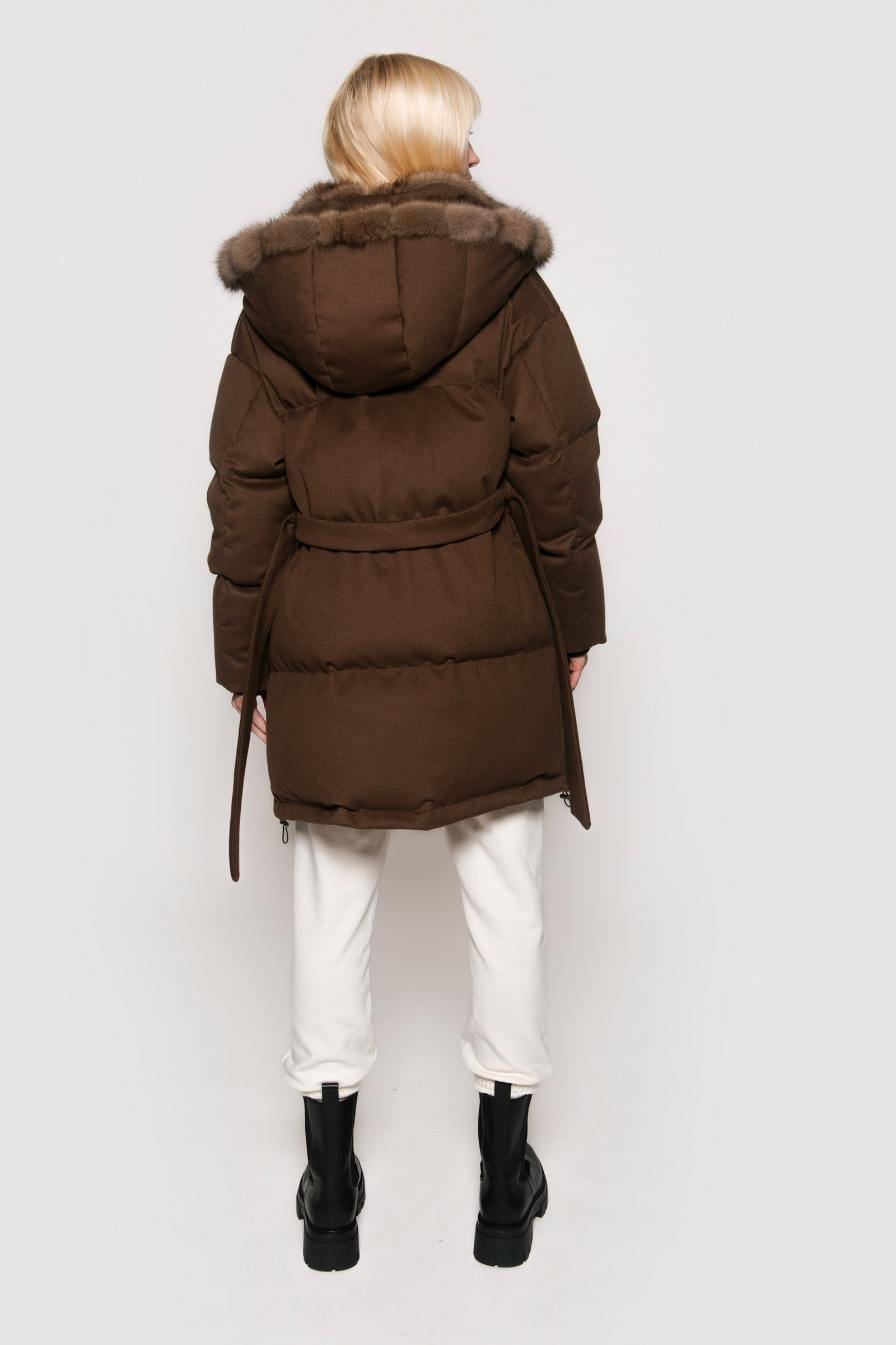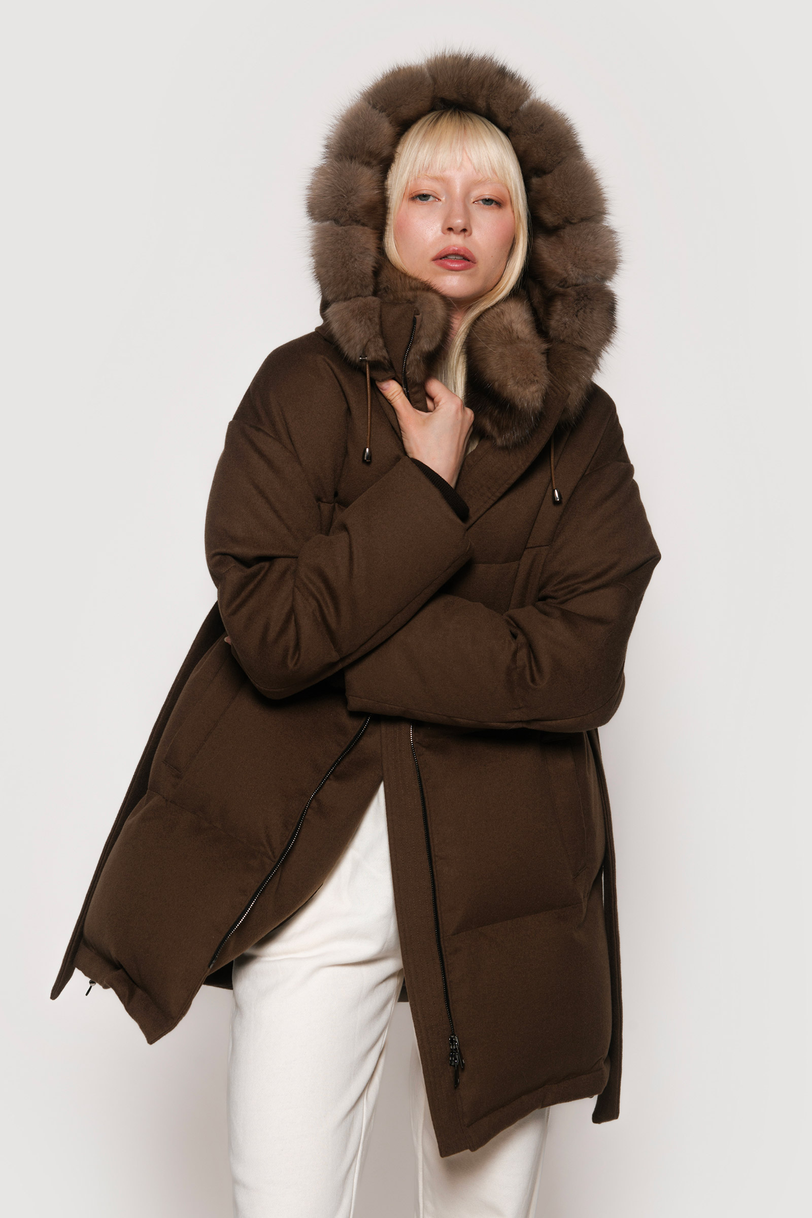 Each Cashmere down jacket with graphite sable is designed with the finest quality fur, with expert tailoring that accentuates curves and creates a flattering silhouette. The Brown palette is rich and varied, with deep jewel tones, soft pastels, and bold prints that make a statement. The Cashmere down jacket with graphite sable is versatile enough to be worn for any occasion, from a formal gala to a casual brunch with friends. Paired with the right accessories, they are sure to turn heads and make a lasting impression.