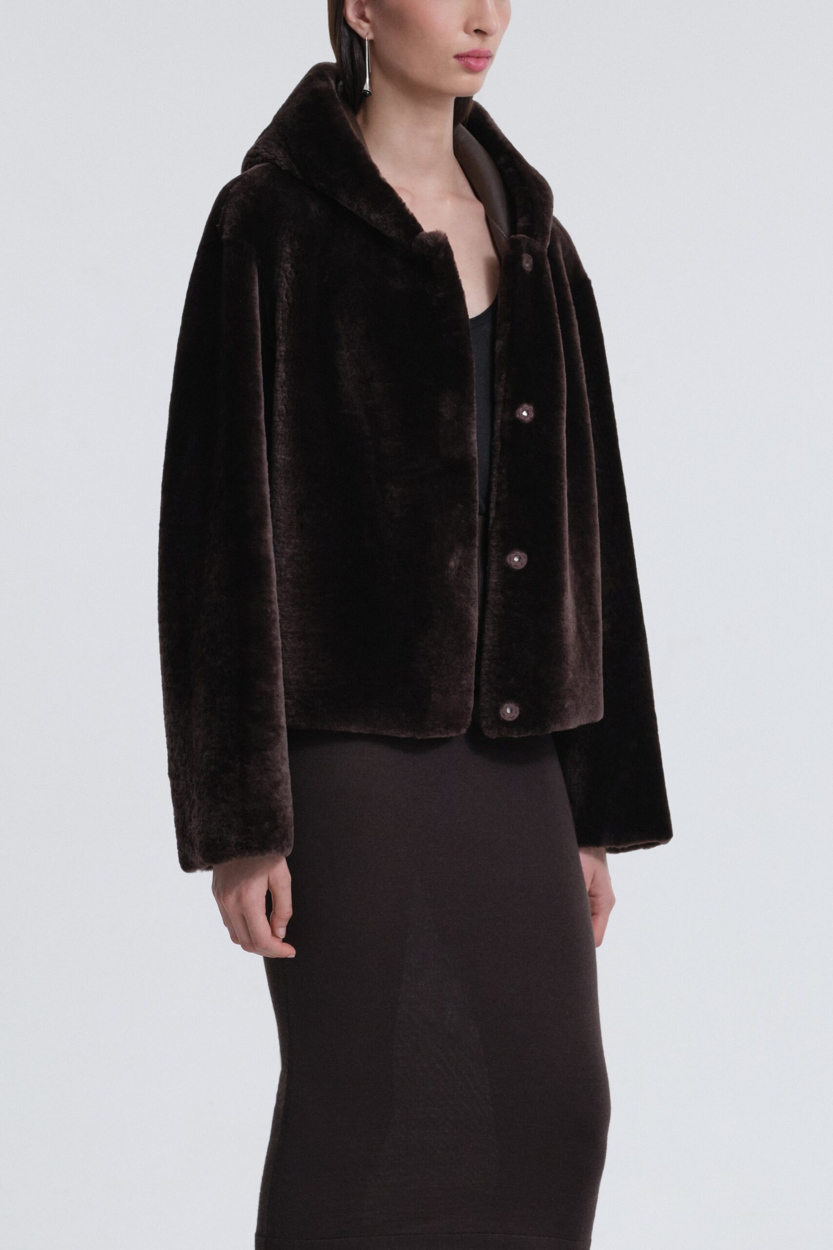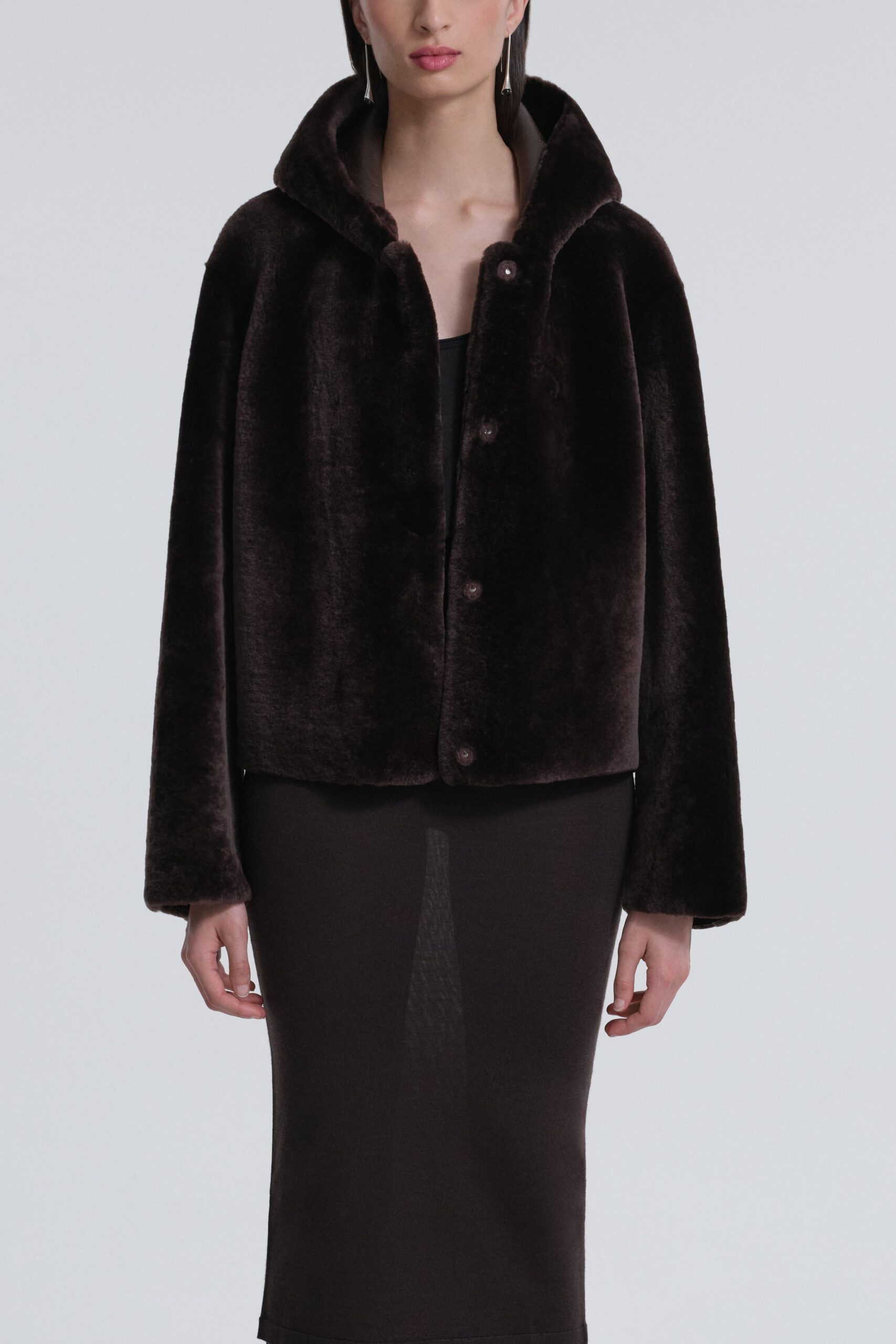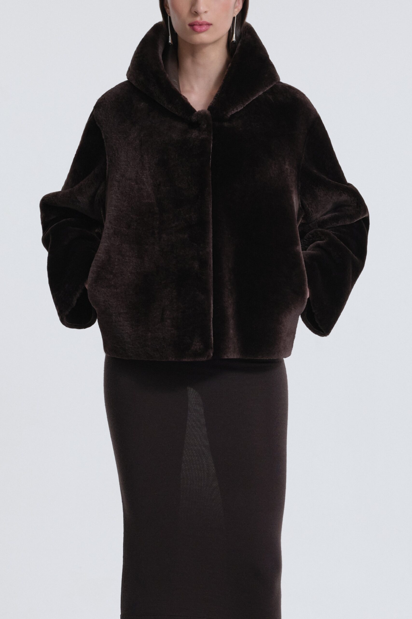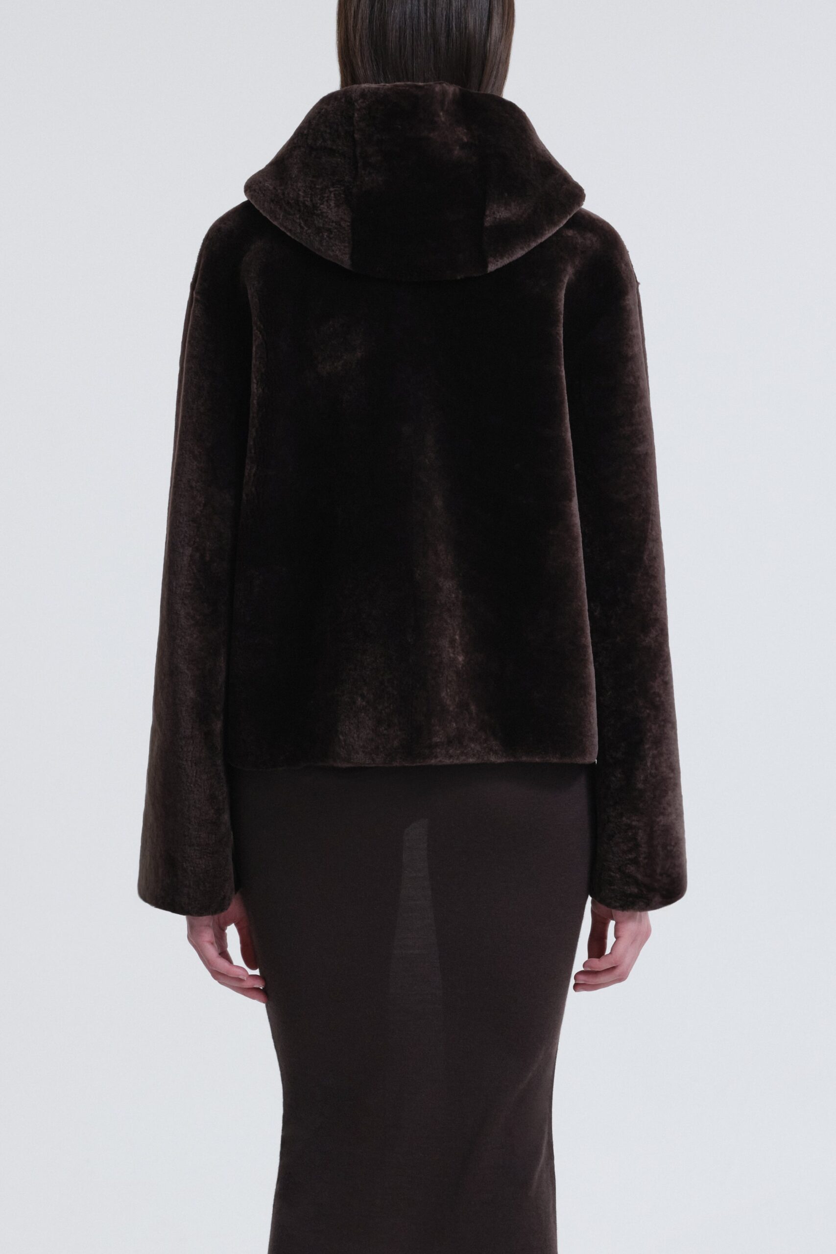 The Cooper Hooded Shearling Jacket A chic cropped jacket crafted from exquisitely plush shearling, designed with a generous hood and sleek zip closure. Unlined for ultimate softness and ease.
