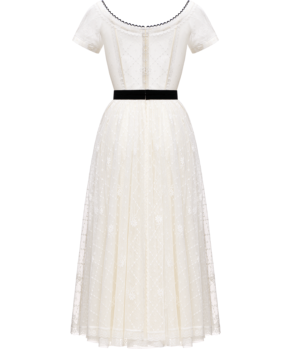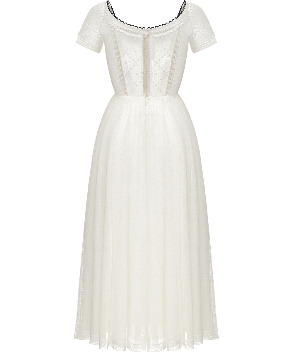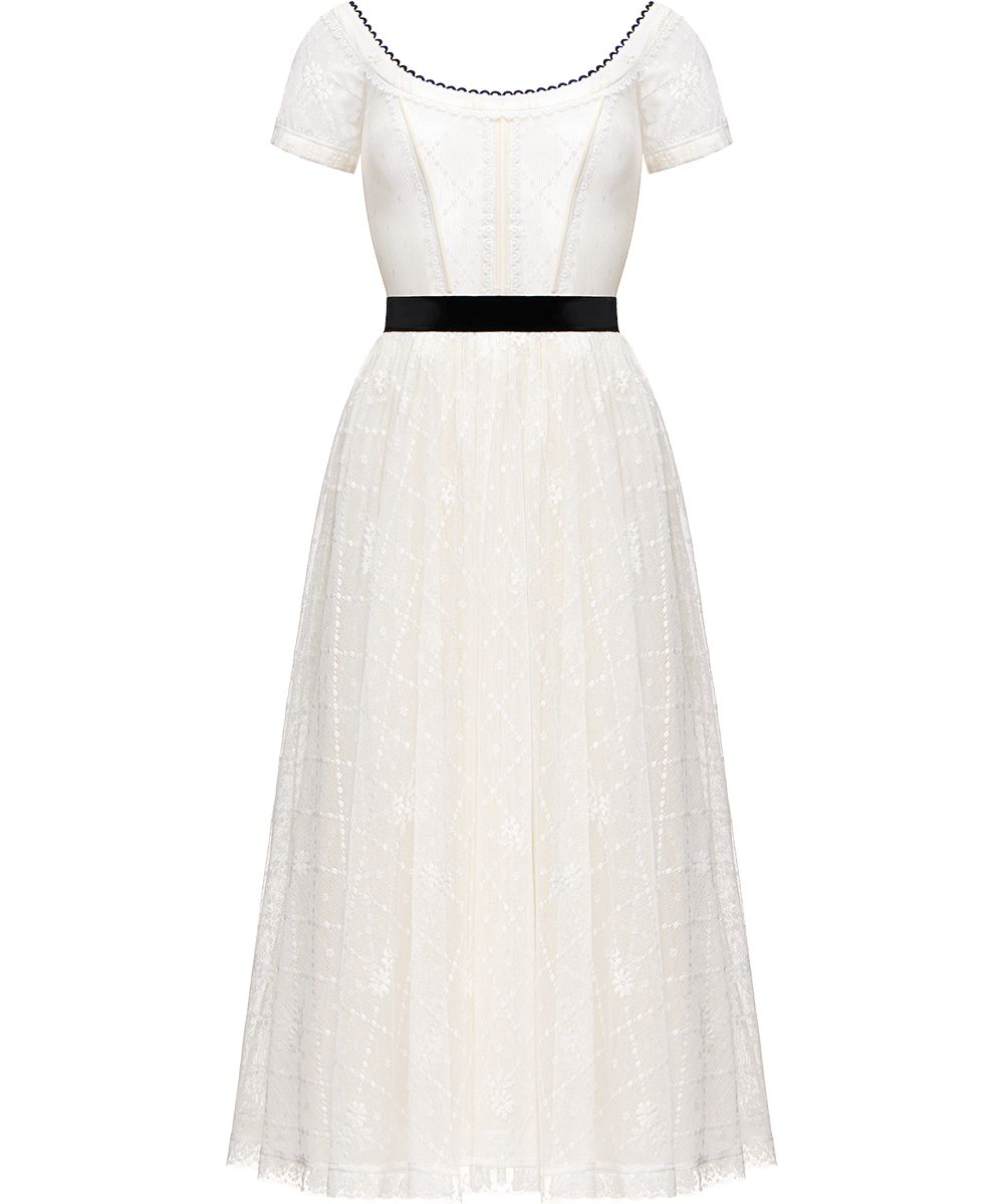Details: This dress, made of cotton lace, showcases a fitted silhouette with a flouncy skirt. The dress is completed with a delicate lace apron featuring a distinctive black rim.