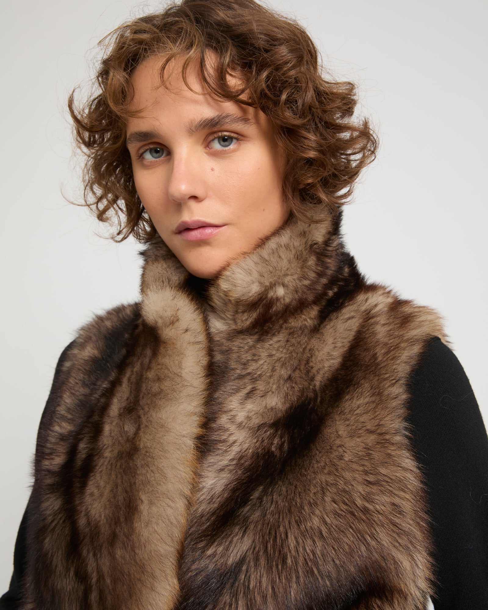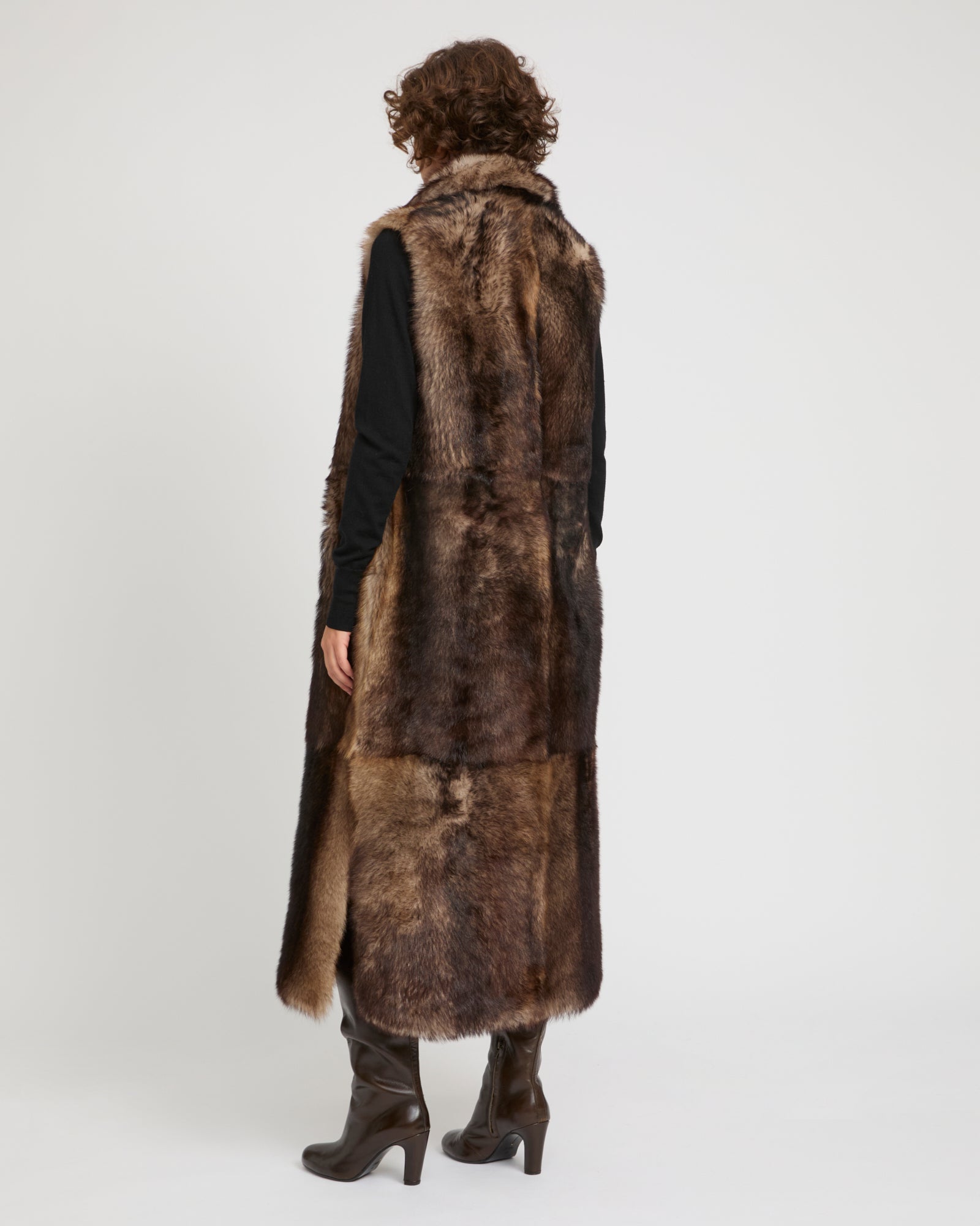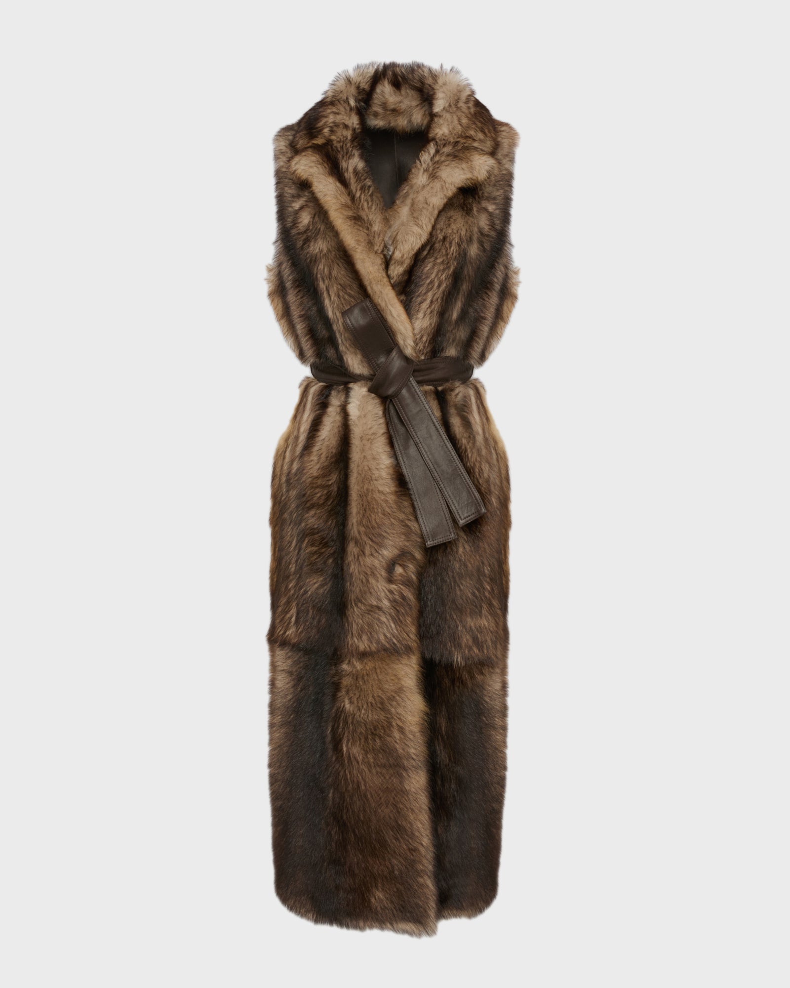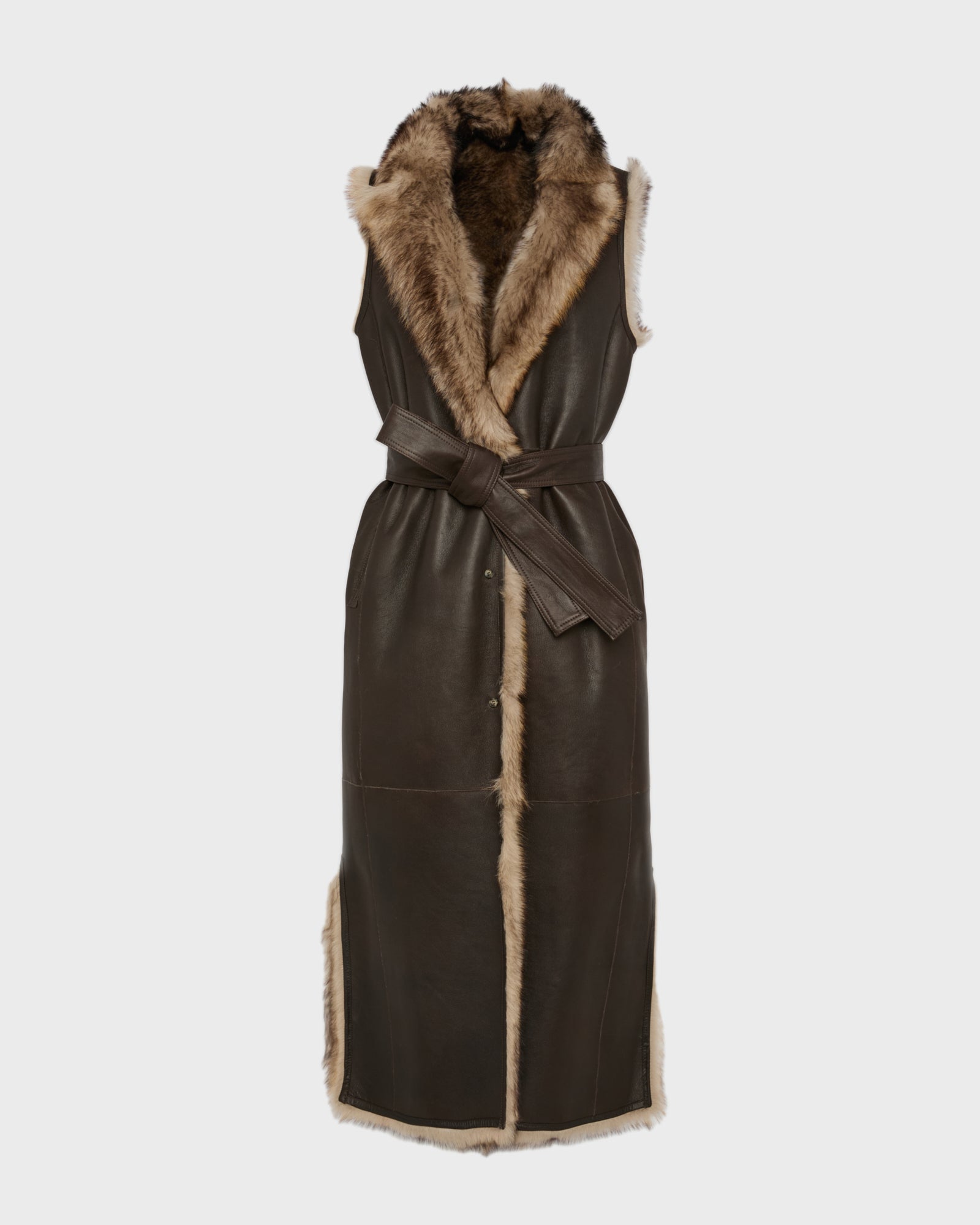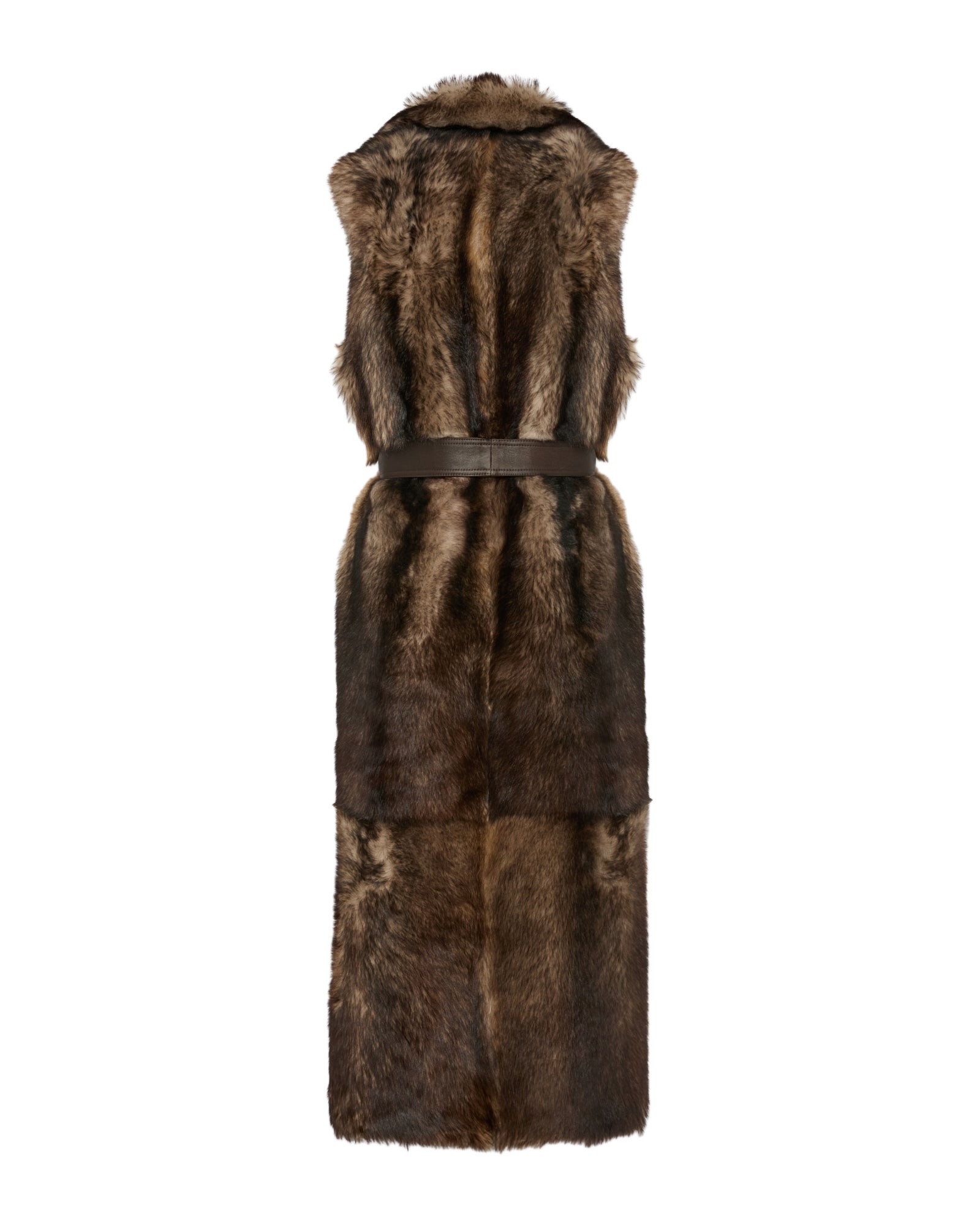 The textures long hair of Toscana lambskin underlines the simple lines of this long gilet which provides a dictinct allure to the wearer. A contrasted leather belt allows it to be cinched according to requirements..