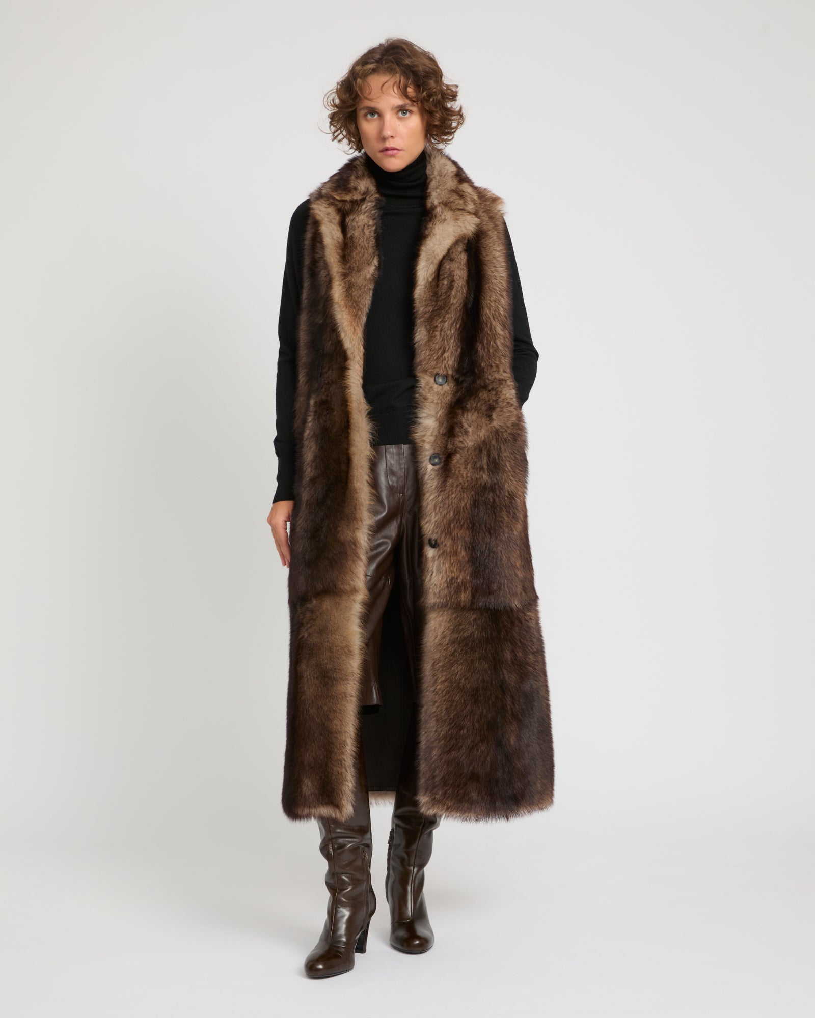 The textures long hair of Toscana lambskin underlines the simple lines of this long gilet which provides a dictinct allure to the wearer. A contrasted leather belt allows it to be cinched according to requirements.